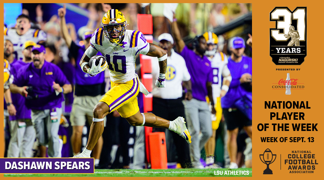 DALLAS (FWAA) – Snagging a pair of interceptions that included a pick-six as well as guiding the LSU defense to shut down Florida in the second half of their featured game has earned Tigers safety Dashawn Spears the Bronko Nagurski National Defensive Player of the Week by the Football Writers Association of America.
